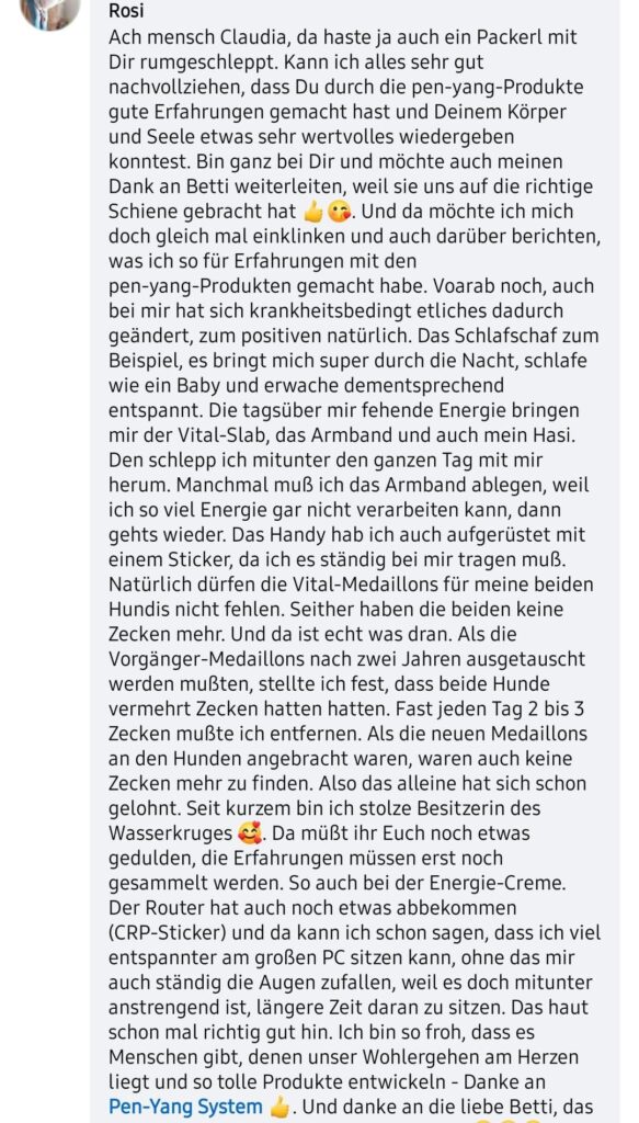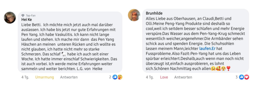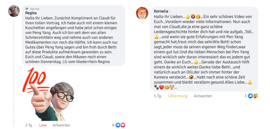 Es gab auch von den Followern der Bunten Zwergdackel unter dem verlinkten Video auf Facebook zahlreiche positive Erfahrungsberichte zu unseren PEN-YANG Produkten, die wir Ihnen auszugsweise abbilden: